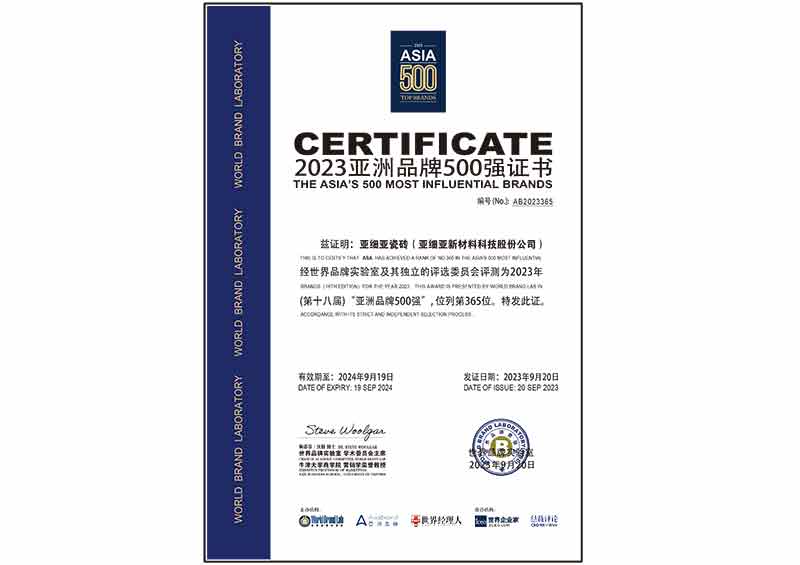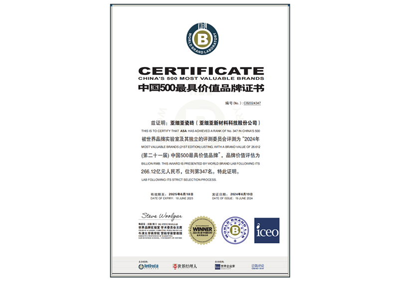 2024年-亚粉色视频APP在线瓷砖中国500最具价值品牌证书